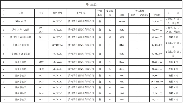 一、拍賣標的:貴州茅臺酒計224瓶、五糧液酒計406瓶及其他酒水、物品一批,整體打包拍賣,參考價:117.83萬元。競買保證金:10萬元。詳情請點擊見下方明細表查看: