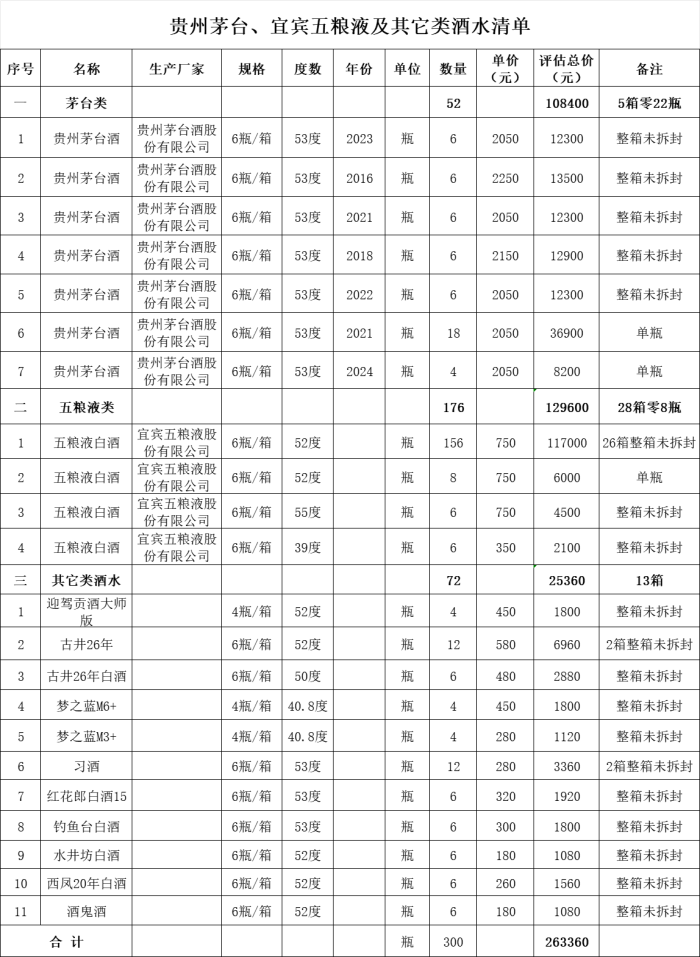 一、拍賣標(biāo)的:茅臺酒計(jì)52瓶、五糧液計(jì)176瓶及其它類酒水計(jì)72瓶,整體打包拍賣,參考價(jià):26.336萬元,競買保證金:2萬元。標(biāo)的詳見下方清單: