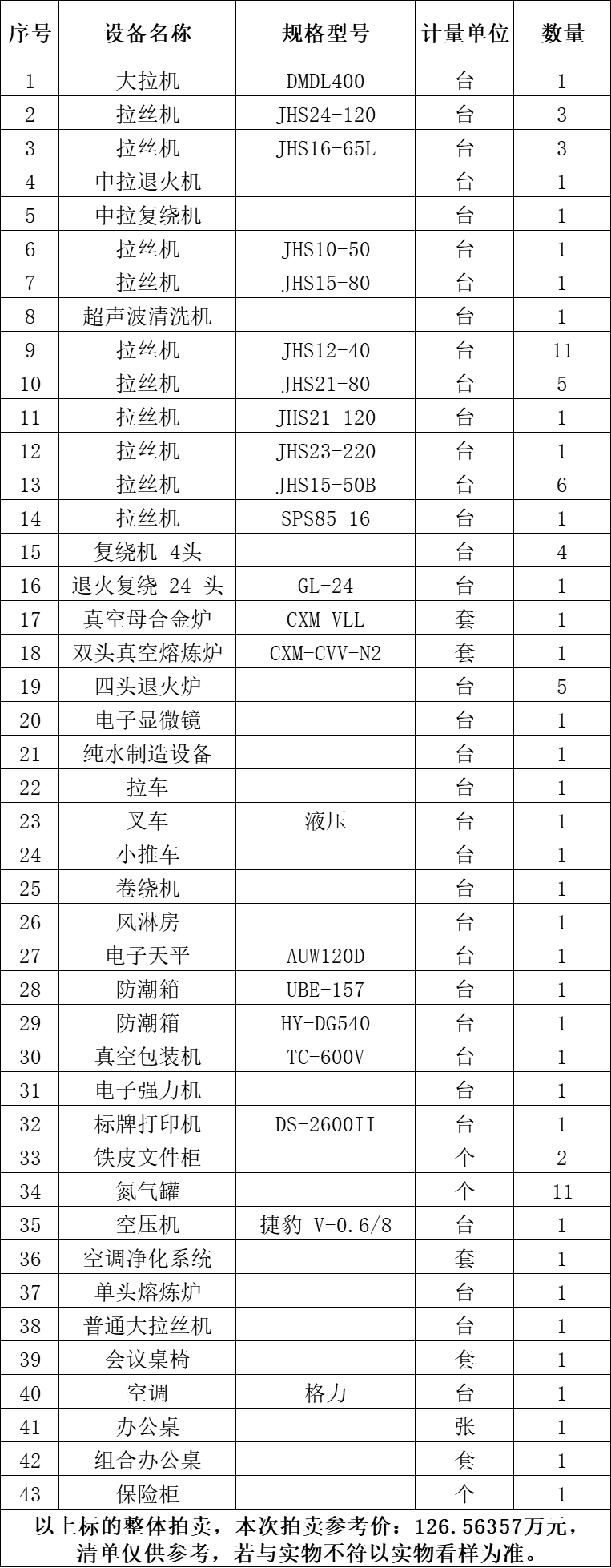 一、拍賣標的:雙頭真空熔煉爐、真空母合金爐、空調凈化系統(tǒng)、拉絲機、復繞機4頭、大拉機、單頭熔煉爐等二手設備一批,整體拍賣,參考價:126.56357萬元。競買保證金:15萬元。