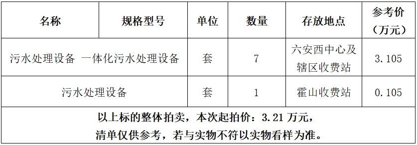 1、污水處理設(shè)備一批,起拍價:3.21萬元,競買保證金:1萬元。標(biāo)的詳情見下方所附清單: