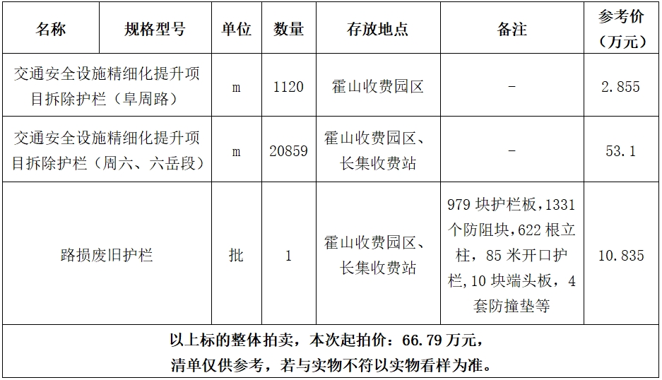 2、廢舊護(hù)欄一批,起拍價:66.79萬元,競買保證金:5萬元。標(biāo)的詳情見下方所附清單: