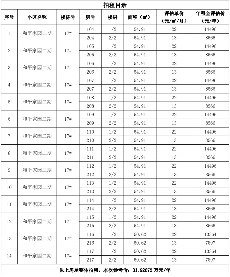 和平家園安置小區(qū)二期17#樓14套商業(yè)用房3年期租賃經(jīng)營(yíng)權(quán),整體面積為1520.32㎡,整體拍租,參考價(jià):31.92672萬(wàn)元/年。競(jìng)租保證金:5萬(wàn)元。