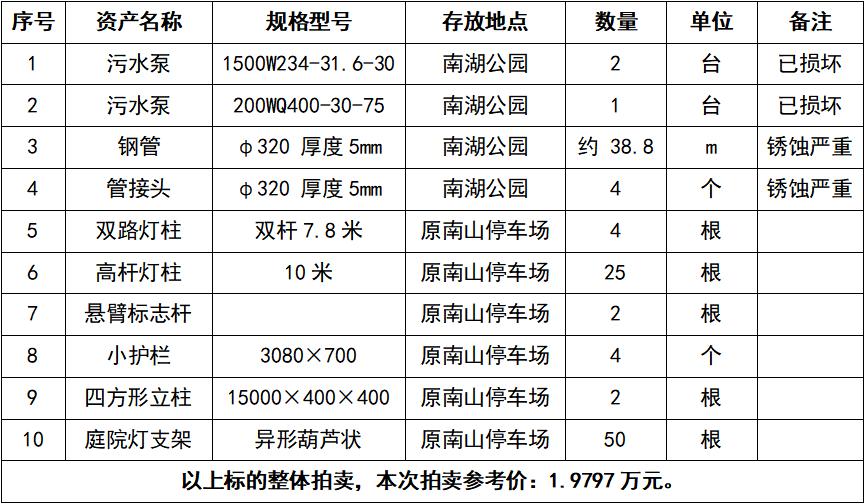 1、廢舊設(shè)備耗材一批,包括污水泵、鋼管、高桿燈柱、懸臂標(biāo)志桿、四方形立柱等,參考價(jià):1.9797萬(wàn)元,競(jìng)買保證金:1萬(wàn)元。