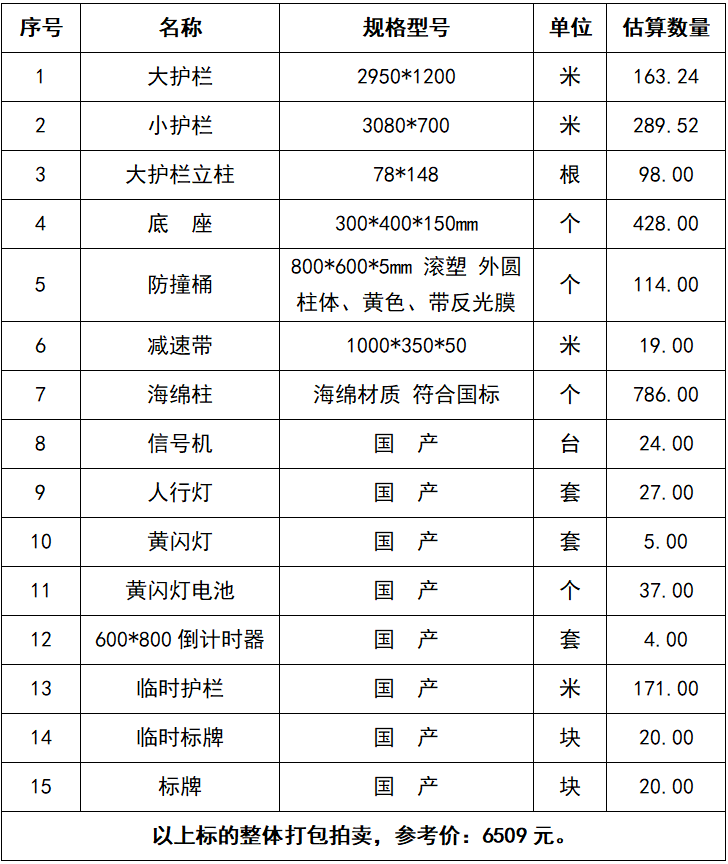 一、拍賣標的:廢舊物資一批,包括護欄、防撞桶、黃閃燈電池等,參考價:6509元。