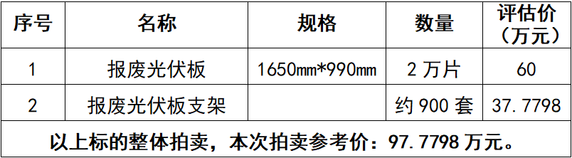 一、拍賣標(biāo)的:報廢光伏板2萬片及報廢光伏板支架約900套,整體拍賣,參考價:97.7798萬元。競買保證金:15萬元。