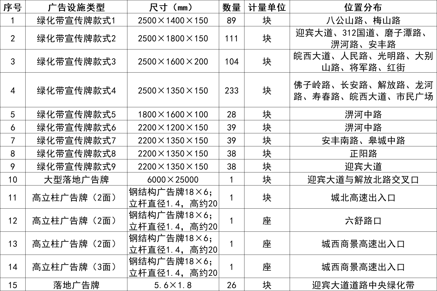 六安城區(qū)750塊戶外廣告牌5年期經(jīng)營權,包括:綠化帶廣告牌719塊、大型落地廣告牌1塊、高立柱廣告牌4塊、落地廣告牌26塊。以上標的整體按5年期經(jīng)營權總價拍賣,5年期總參考價:277.78萬元,競買保證金:20萬元。