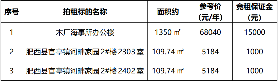 一、拍租標(biāo)的:六安市金安區(qū)木廠海事所辦公樓及肥西縣官亭鎮(zhèn)河畔家園2#樓2303室、2402室房屋3年期租賃權(quán),拍租詳情見下表: