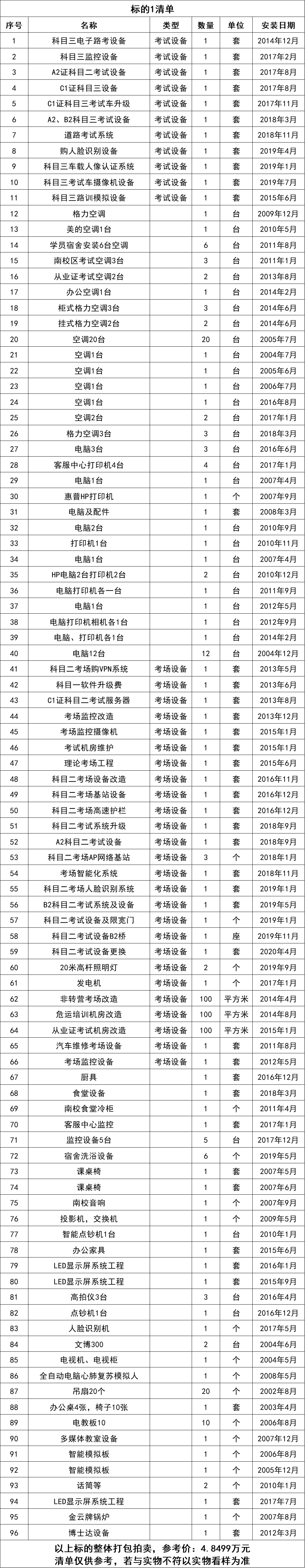 1、空調(diào)、考場高速護(hù)欄、考試設(shè)備等廢舊物資一批,打包拍賣。參考價:4.8499萬元,競買保證金:1萬元。標(biāo)的清單見下方表格(清單僅供參考,若與實物不符以實物看樣為準(zhǔn)):