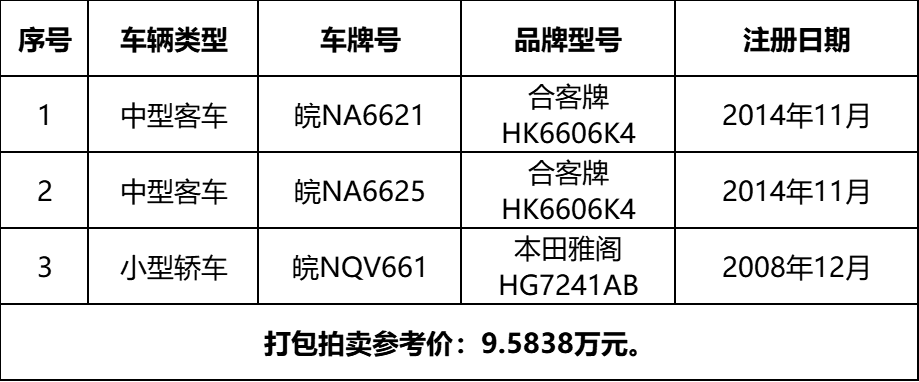 3、皖NA6621合客牌中型客車、皖NA6625合客牌中型客車、皖NQV661本田雅閣小型轎車等3輛二手車,打包拍賣。參考價:9.5838萬元,競買保證金:1萬元。標(biāo)的詳情見下表: