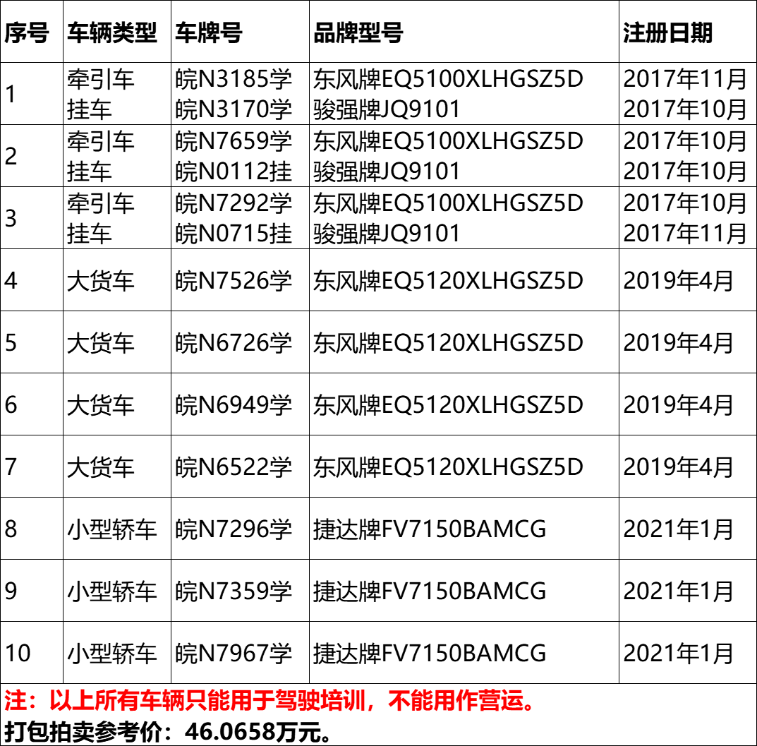 4、皖N3185學(xué)/皖N3170學(xué)牽引掛車、皖N7526學(xué)東風(fēng)牌大貨車、皖N7296學(xué)捷達(dá)牌小型轎車等10輛二手車,打包拍賣。參考價:46.0658萬元,競買保證金:5萬元。標(biāo)的詳情見下表: